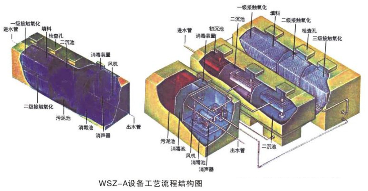 WSZ-A设备的设计主要是对生活污水和与之类似的工业有机污水处理,其主要处理手段是采用目前较为成熟的生化处理技术接触氧化法,水质参数按一般生活污水水质设计计算,进水BOD5按200mg/l计,出水BOD5按20mg/l计。共有六部份组成:
