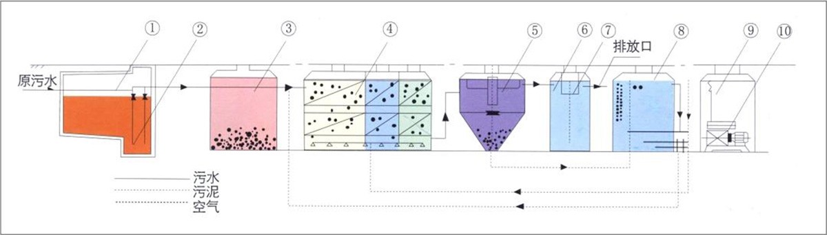 1、初沉池:该设备初沉池为坚流式沉淀池。污水在沉淀池的上升流速为0.3-0.7毫米/秒,沉淀下来的污泥用空气提至污泥池。(注:WSZ-A0.5-5m³/h污泥自流到污泥池中)