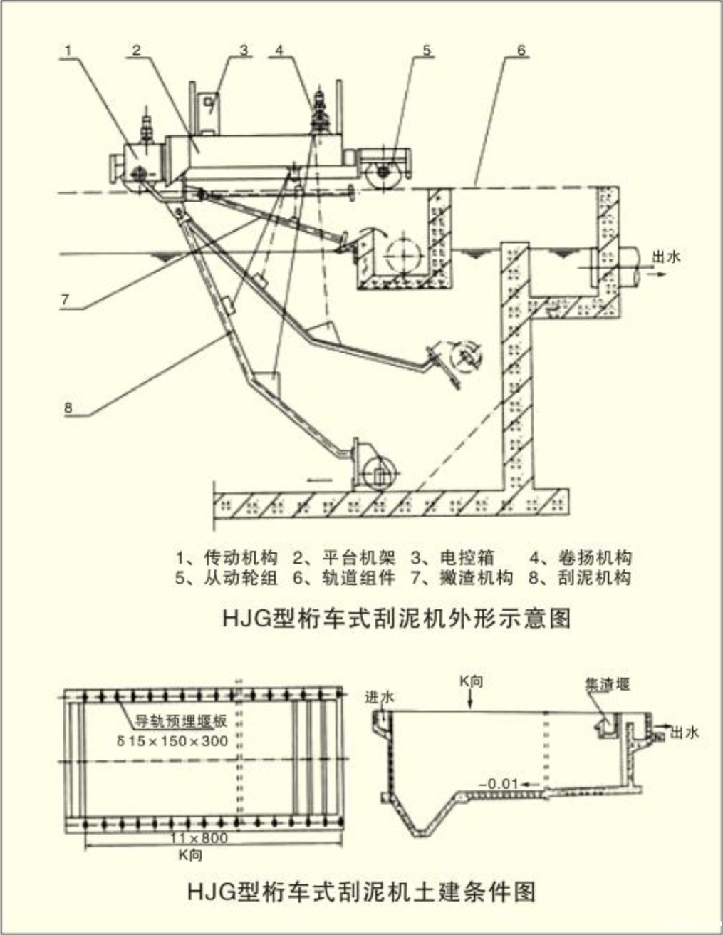 本机由行车桁架、驱动装置、撇渣机构、刮板升降机构、程序控制及限位装置等组成。动力线及信号线的收放装置可按用户的要求提供电缆卷简、滑触线及滑线装置。刮泥机构在不刮泥回程时刮泥耙全部抬起。当回到刮泥的起始位置时,刮泥耙落下。